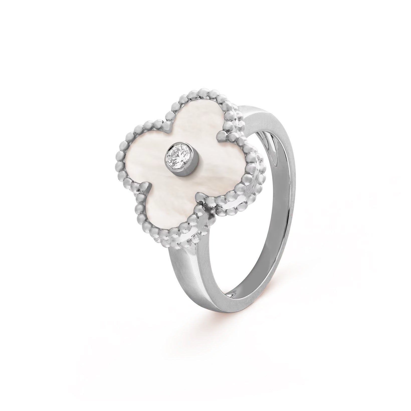 Vintage Alhambra ring, rhodium plated 18K white gold, white mother-of-pearl, round diamond; diamond quality DEF, IF to VVS.