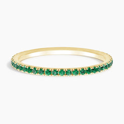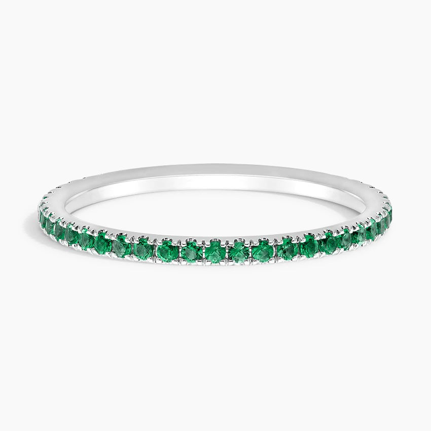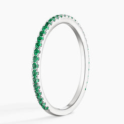 This dainty ring showcases delicately set pavé emeralds within beautifully crafted prongs that extend around three-fourths of the band, with a discreet sizing bar at the rear.
