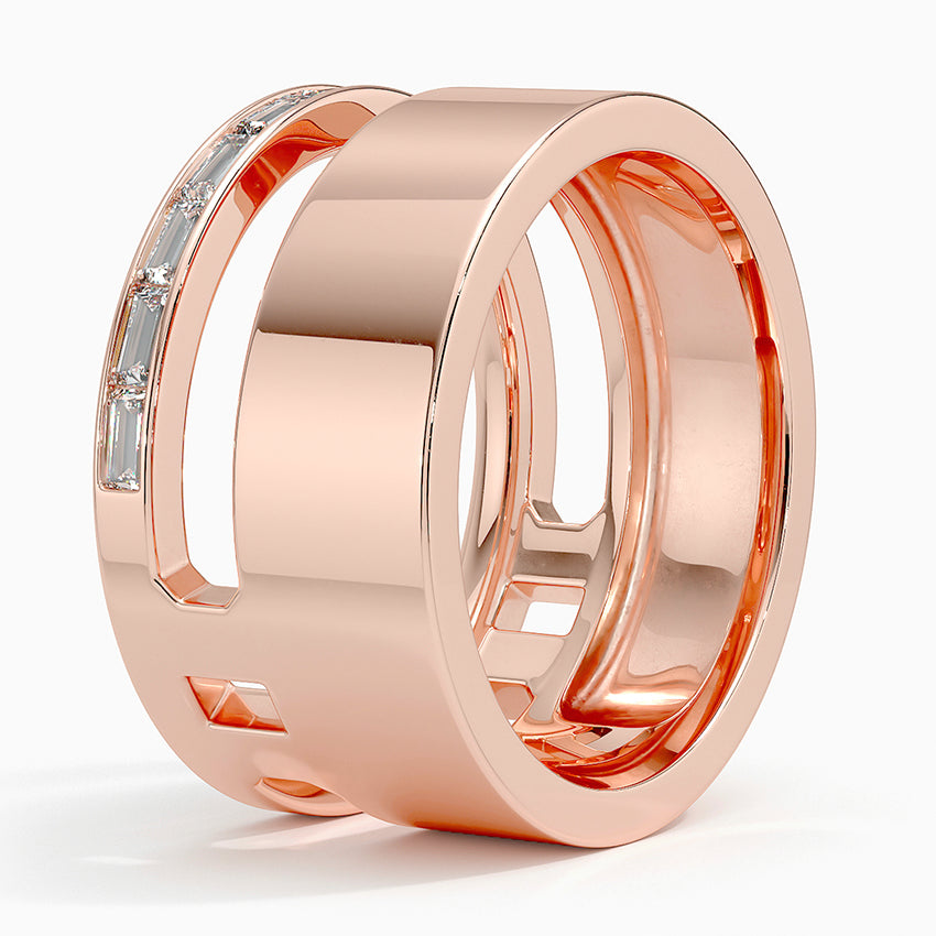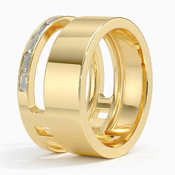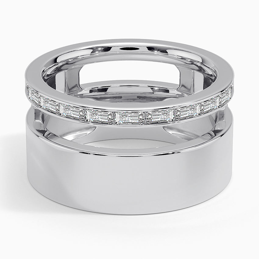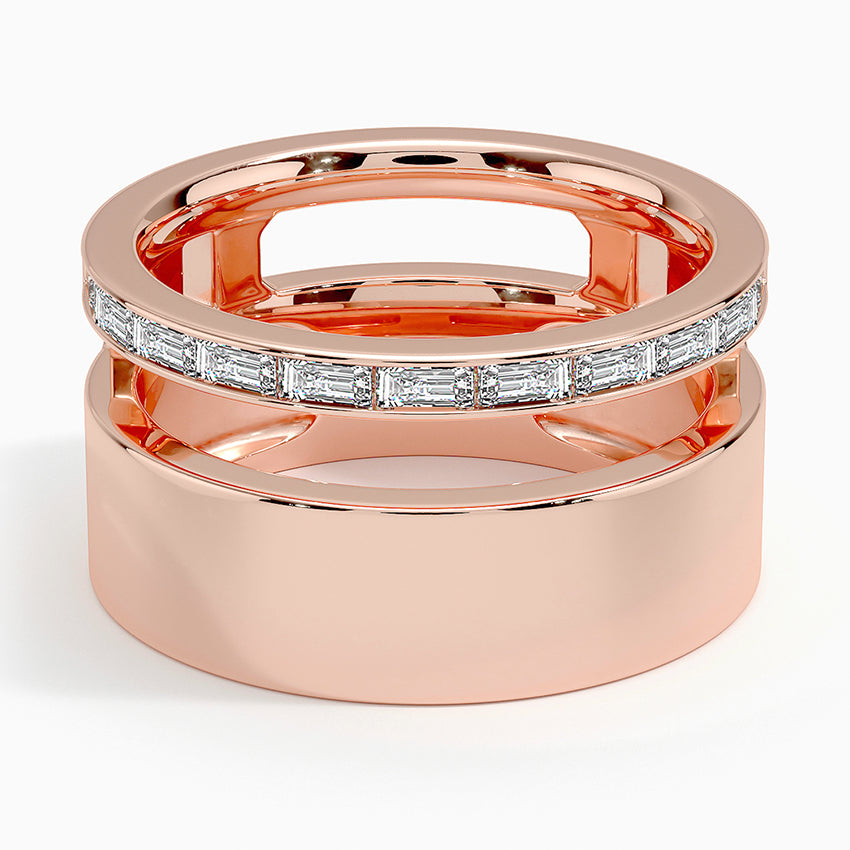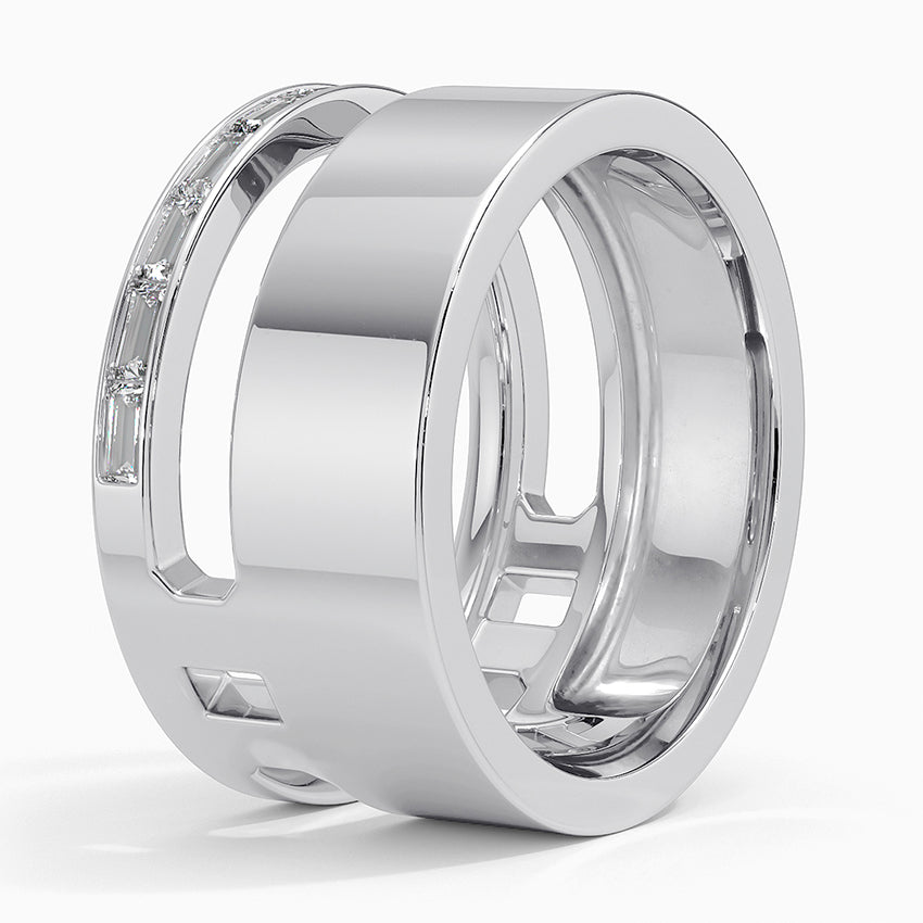 "Experience the best of both worlds with our contemporary ring design. Combining the comfort of a single band with the chic appeal of two, this modern piece features negative space between a sleek plain cigar band and a sparkling baguette diamond band. Plus, a lustrous metal bar at the back ensures added support and style."
