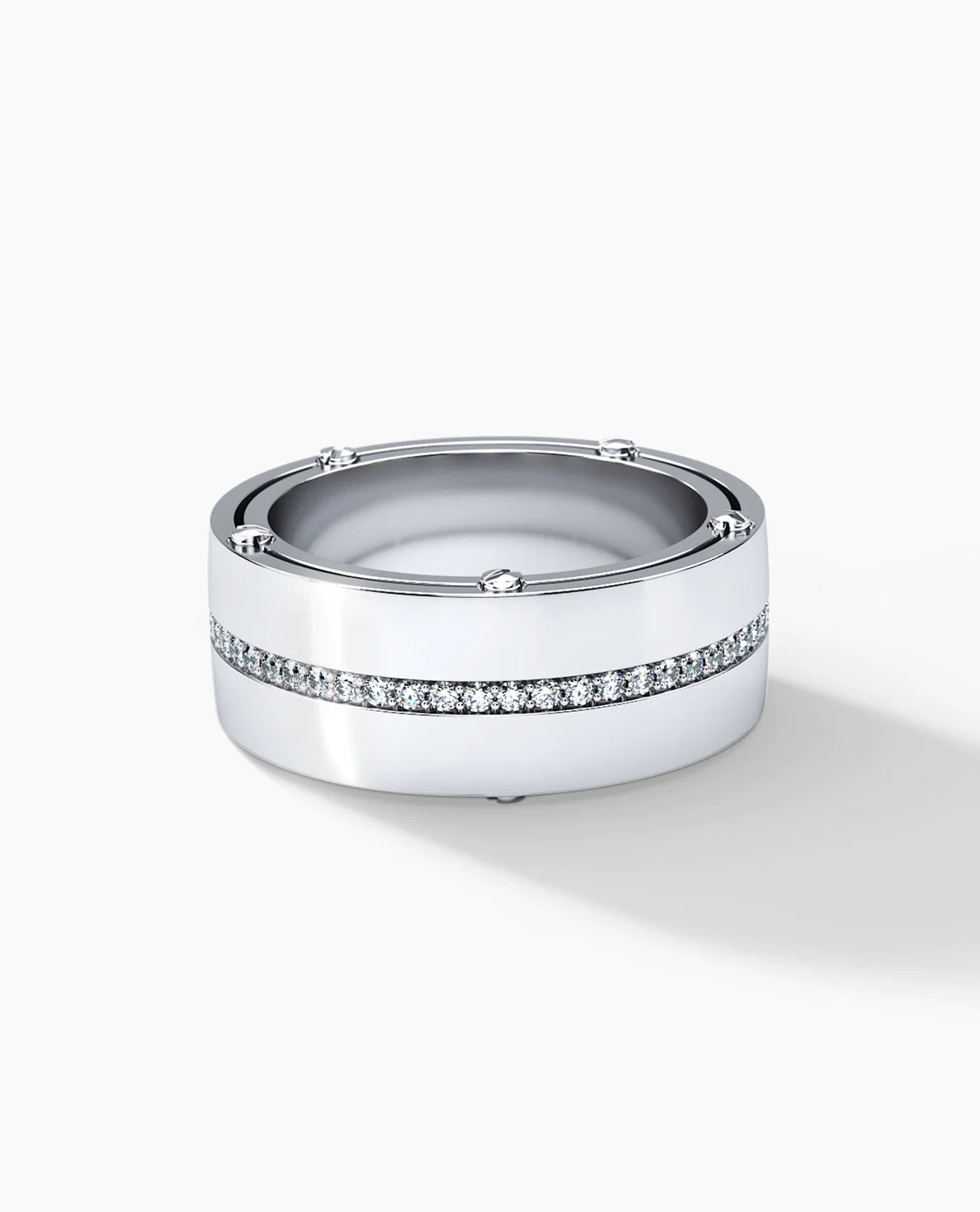 Introducing Our Men's Classic Fit Band with Diamonds – a timeless and sophisticated ring that seamlessly blends classic design with a touch of modern luxury. Meticulously crafted, this ring features a classic fit silhouette adorned with a subtle yet striking row of diamonds.