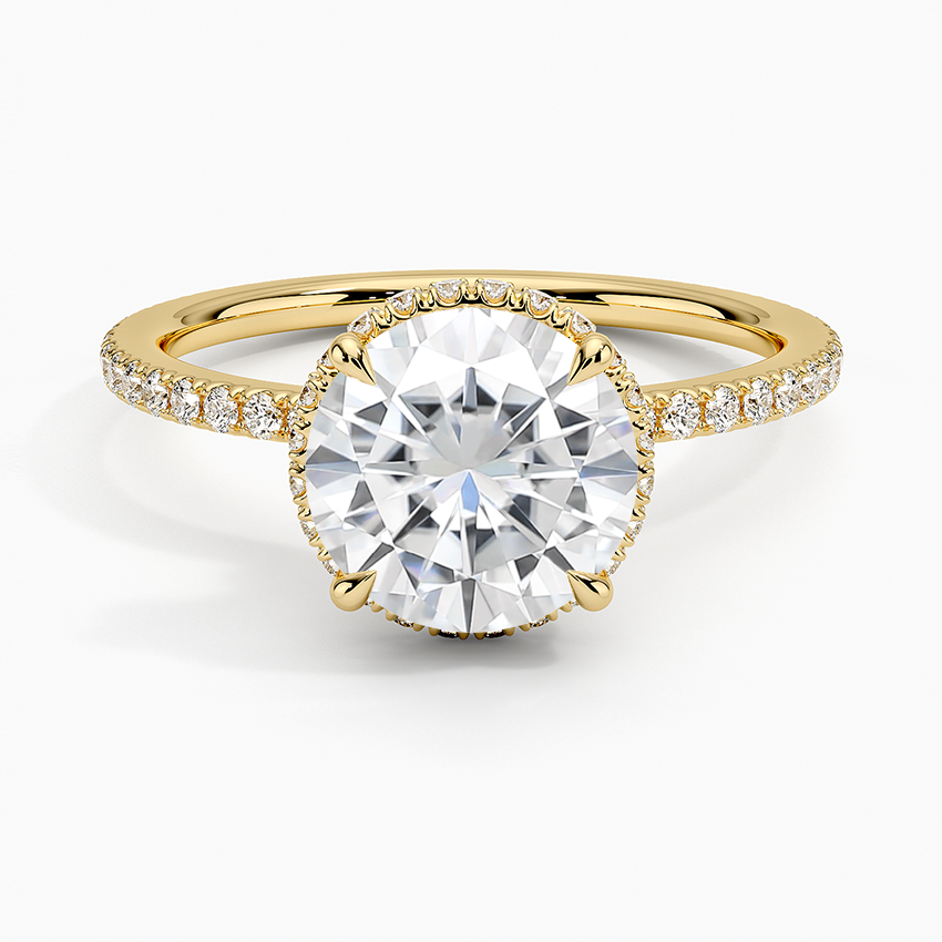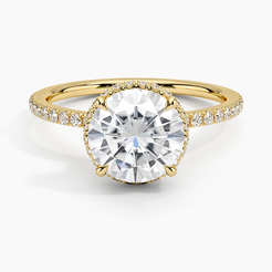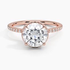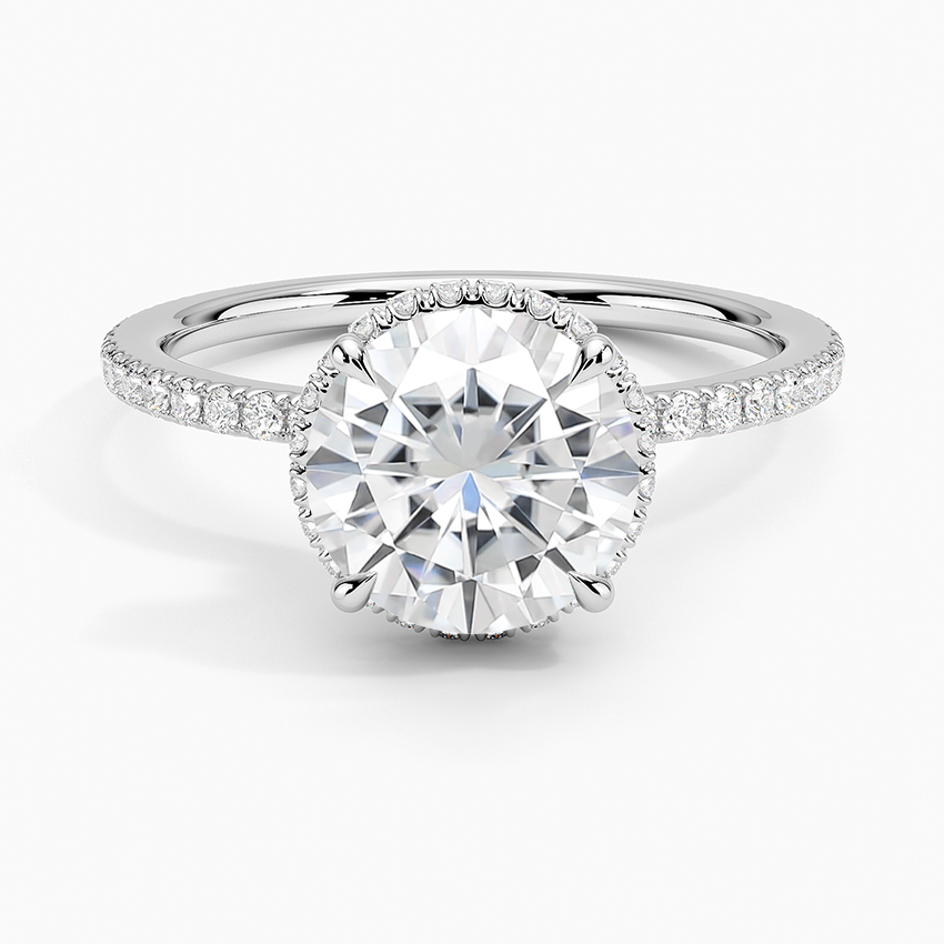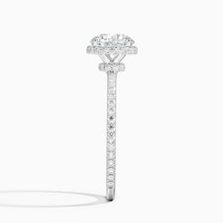 This sophisticated engagement ring showcases twin hidden halos, encircling the center gem with brilliance. A shimmering petite band enhances the gallery, creating an elegant and chic aesthetic.