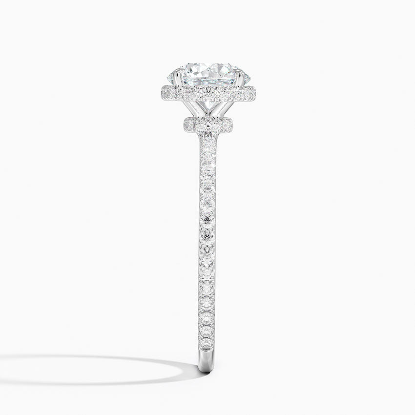 This sophisticated engagement ring showcases twin hidden halos, encircling the center gem with brilliance. A shimmeri...