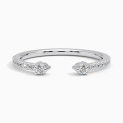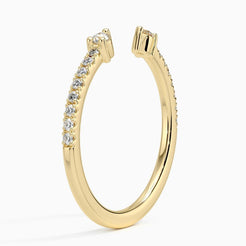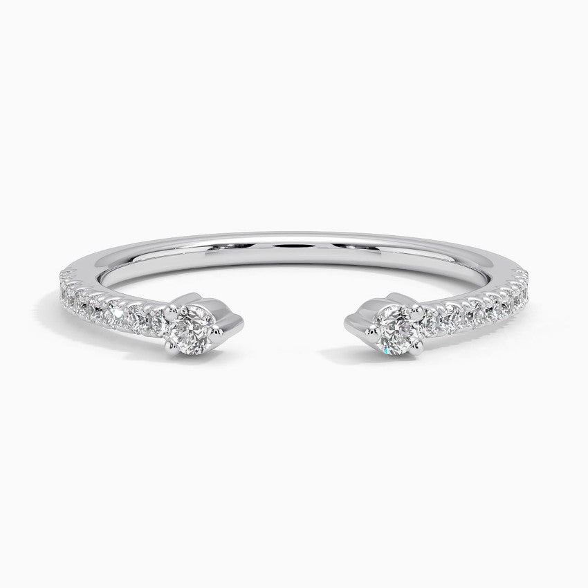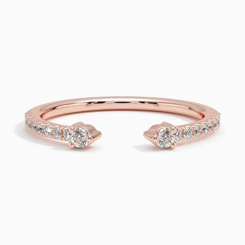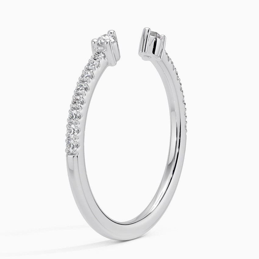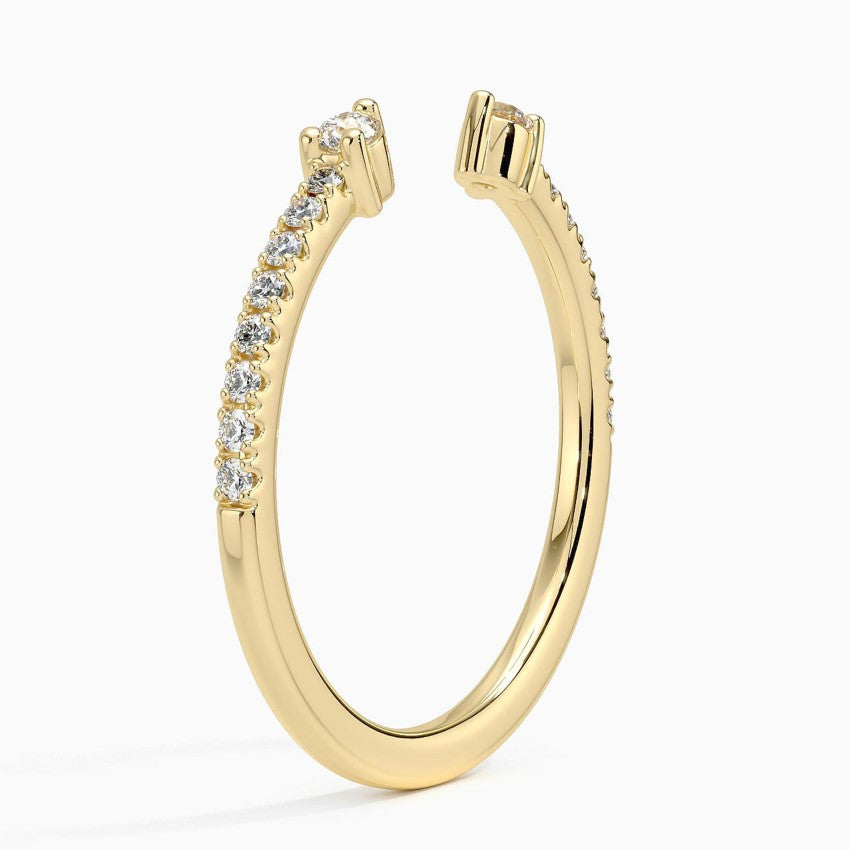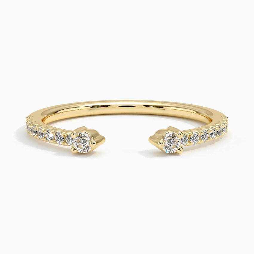 Introducing our petite diamond open ring, adorned with scalloped pavé diamonds delicately cradled in sculpted prongs extending halfway around the band. The graceful design showcases two prong-set diamonds, seamlessly integrating with various engagement ring styles or adding a distinctive touch to any stack.
