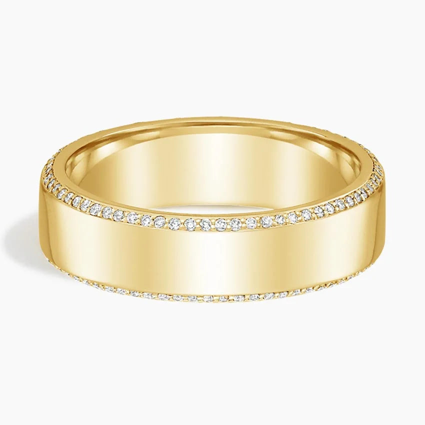 Diamonds wrap around each side of this classic ring with a high polish finish. The interior has a rounded inside edge for increased comfort.