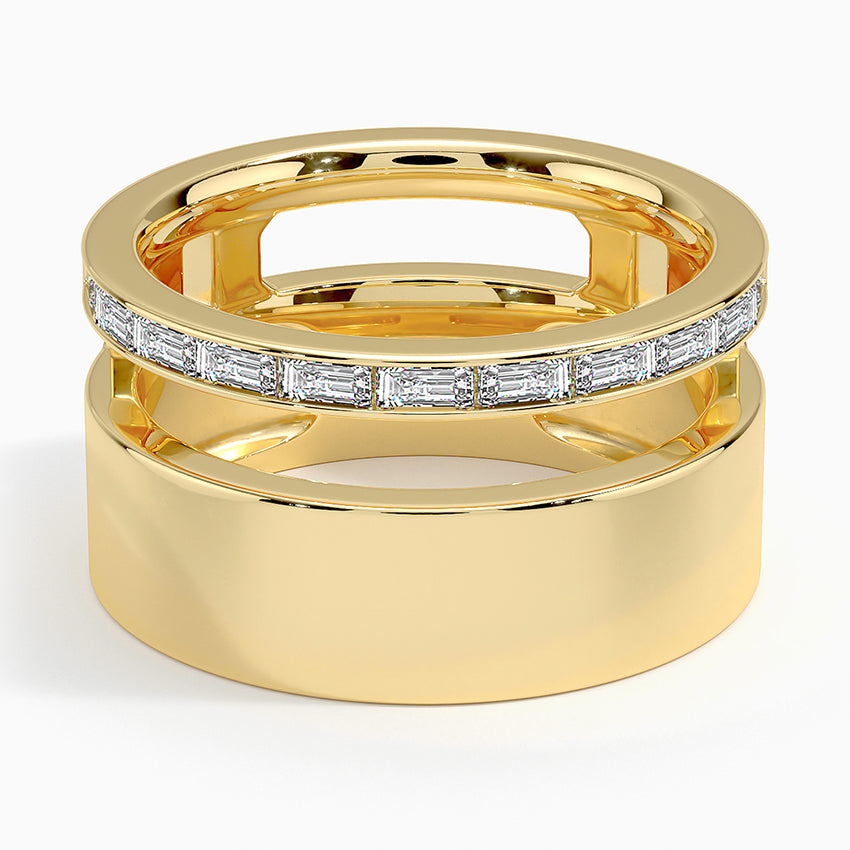 "Experience the best of both worlds with our contemporary ring design. Combining the comfort of a single band with the chic appeal of two, this modern piece features negative space between a sleek plain cigar band and a sparkling baguette diamond band. Plus, a lustrous metal bar at the back ensures added support and style."
