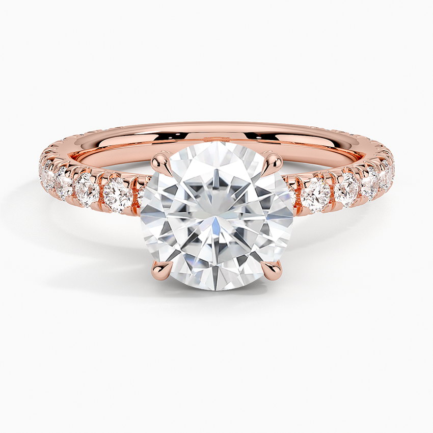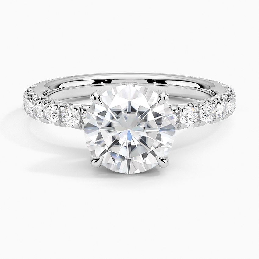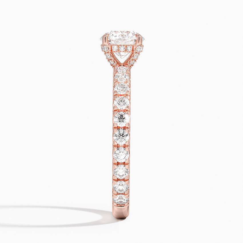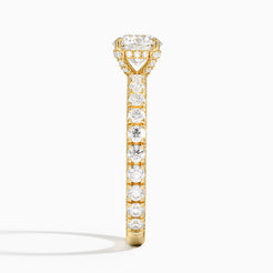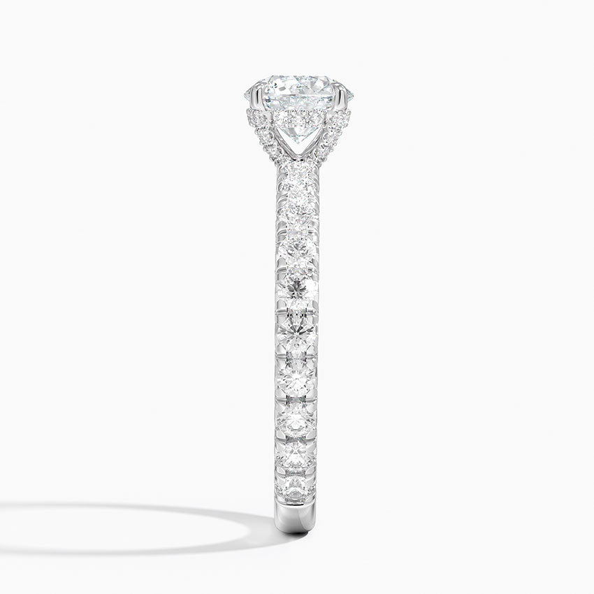 This timeless engagement ring showcases brilliant diamond accents that embellish three-fourths of its circumference. Embraced by graceful claw prongs and a gallery adorned with diamonds, the center gem exudes elegance and charm.