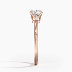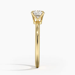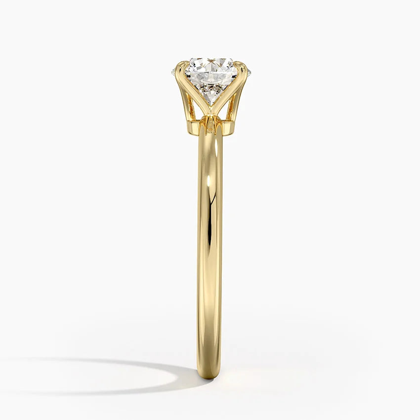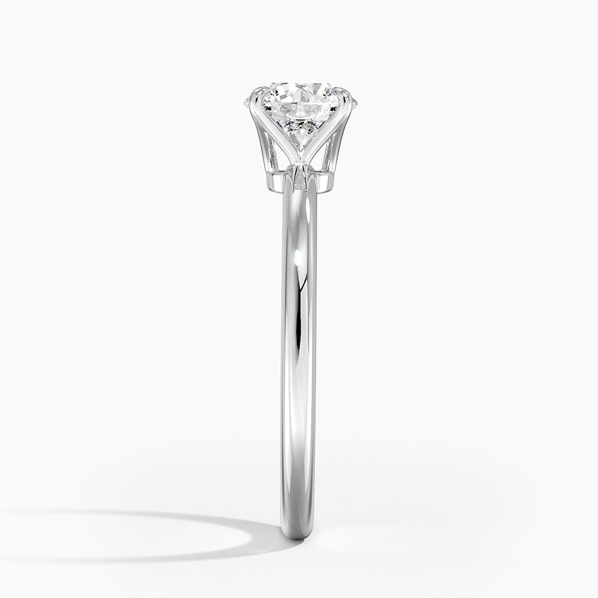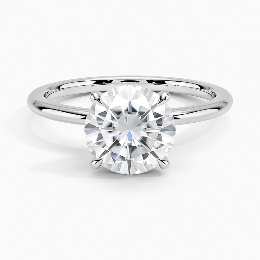 This sophisticated moissanite solitaire engagement ring showcases an open basket design with claw prongs gently embracing the central gemstone. The slender band enhances the timeless and refined aesthetic of this ring.