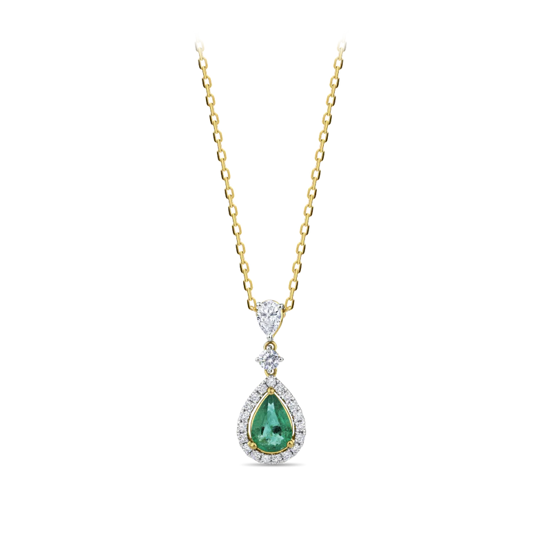 Introducing our Pear Cut Emerald and Diamond Halo Pendant – a striking union of vibrant green elegance and timeless sparkle. This exquisite pendant features a captivating pear-cut emerald embraced by a halo of dazzling diamonds, creating a statement piece that exudes sophistication and natural beauty.