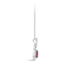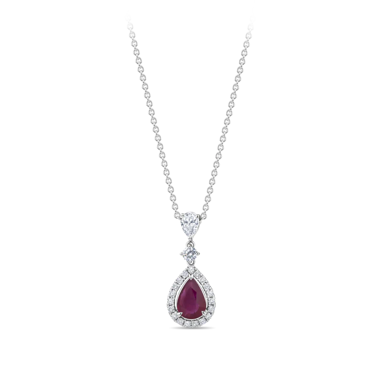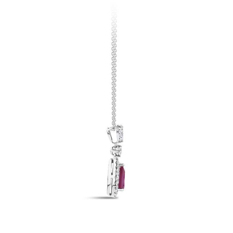 Introducing our Pear Cut Ruby and Diamond Halo Pendant – a stunning marriage of fiery elegance and timeless sparkle. This exquisite pendant showcases a lustrous pear-cut ruby embraced by a halo of dazzling diamonds, creating a captivating statement piece.