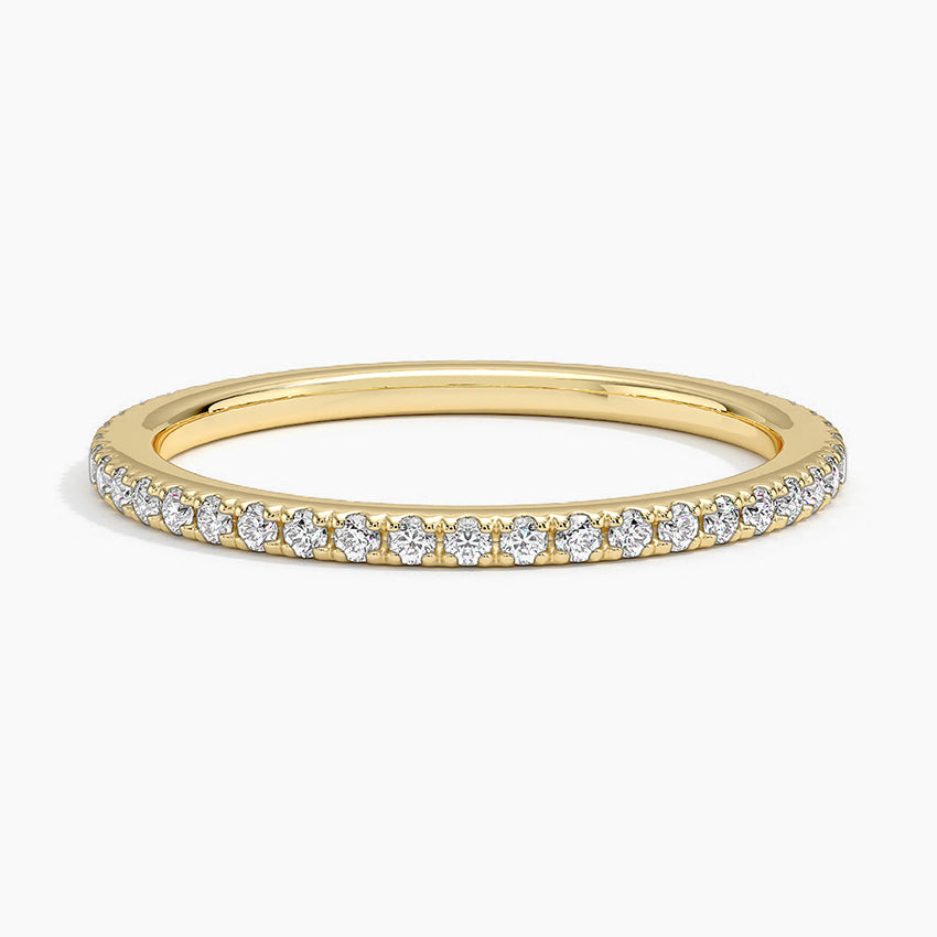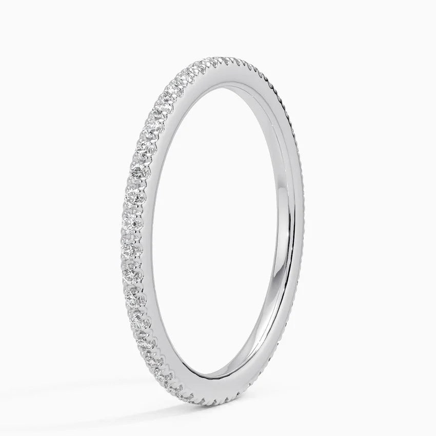 Gracefully encircling the finger with a cascade of radiant brilliance, this stunning band showcases round diamonds nestled in finely crafted shared prongs, extending nearly halfway along the shank to capture unparalleled sparkle.