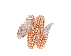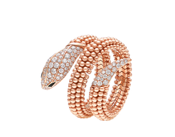 Serpenti two-coil 18 kt rose gold ring set with pavé diamonds on the head and tail, and black onyx eyes